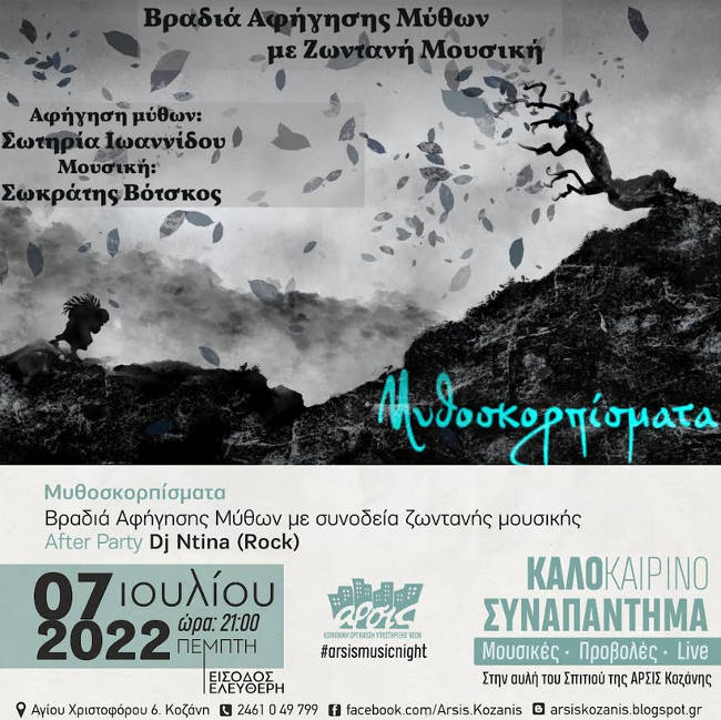 Την Πέμπτη 7 Ιουλίου και ώρα 21:00 τα Μυθοσκορπίσματα έρχονται από την Θεσσαλονίκη, στην αυλή του σπιτιού της ΑΡΣΙΣ Κοζάνης, για να σας αφηγηθούν παλιούς μύθους και θρύλους της ελληνικής υπαίθρου.