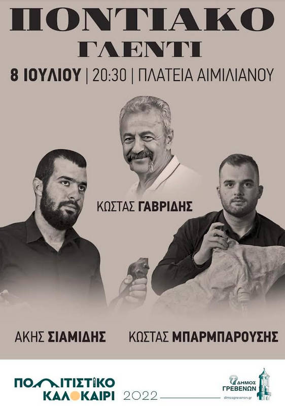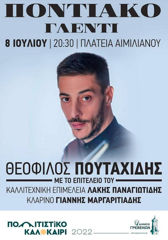 Υπενθυμίζεται ότι στην εξέδρα της κεντρικής μας πλατείας, θα συναντηθούν τέσσερις σπουδαίοι καλλιτέχνες της μοναδικής μουσικής παράδοσης του Πόντου και μιλάμε για τον δημοφιλή Θεόφιλο Πουταχίδη με όλο του το επιτελείο καθώς και τους εξαίρετους Γρεβενιώτες Κώστα Γαβρίδη, Άκη Σιαμίδη και Κώστα Μπαρμπαρούση.