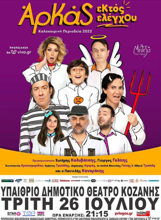 Την Τρίτη 26 Ιουλίου, οι θεατρικές παραγωγές Μέθεξις παρουσιάζουν την παράσταση ΑΡΚΑΣ «Εκτός Ελέγχου» με τα κείμενα του Αρκά, στο Υπαίθριο Δημοτικό Θέατρο της Κοζάνης. Η νούμερο ένα κωμωδία της χρονιάς, με ένα λαμπερό θίασο πρωταγωνιστών και καλλιτεχνικών συντελεστών ταξιδεύει σε όλες τις γωνιές της Ελλάδας, προσφέροντας άφθονο γέλιο σε όλη την οικογένεια.
