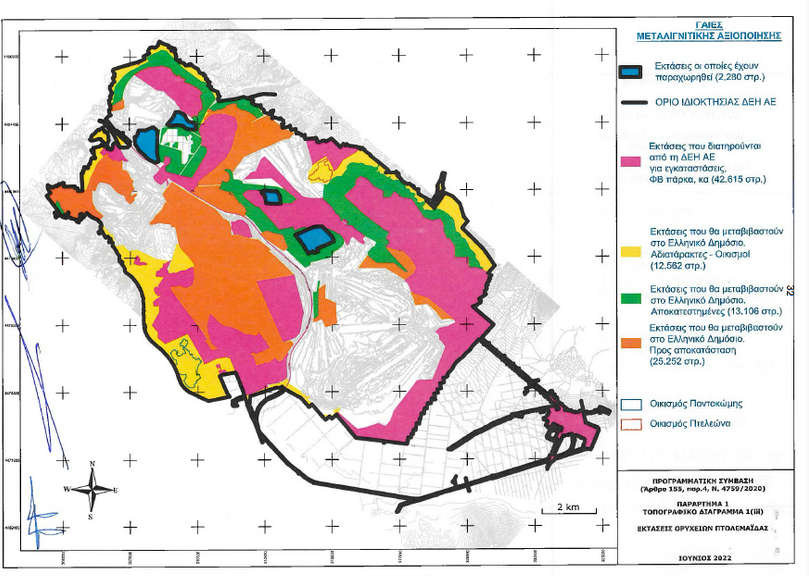 - Η ΔΕΗ διατηρεί στην κατοχή της 85.423 στρ. ενώ μεταβιβάζει στο Ελληνικό Δημόσιο (Μετάβαση Α.Ε.) 97.008 στρ.