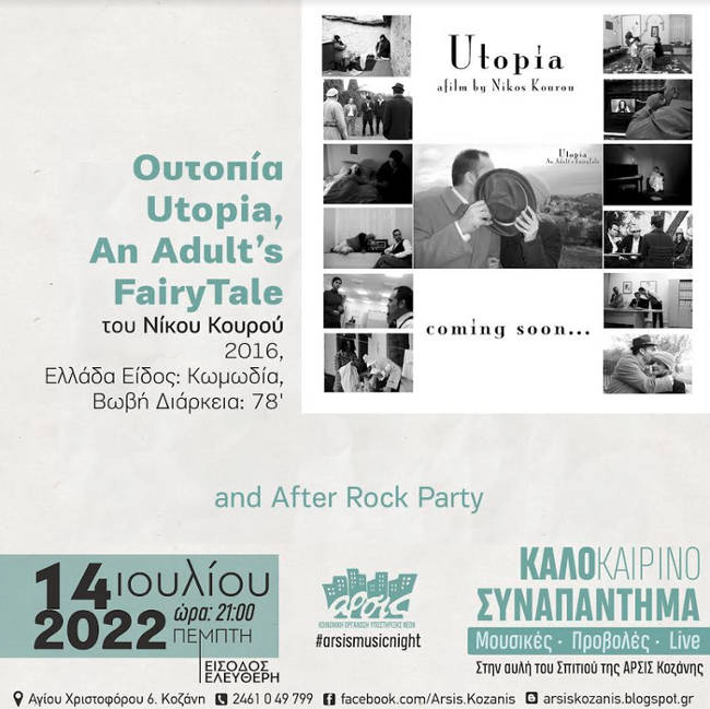 Την Πέμπτη 14 Ιουλίου και ώρα 21:00 έρχεται στην αυλή του σπιτιού της ΑΡΣΙΣ Κοζάνης, η ταινία του Κοζανίτη σκηνοθέτη Νίκου Κουρού: «Ουτοπία/Utopia, An Adults FairyTale», με μια πληθώρα τοπικών συντελεστών και ηθοποιών (επαγγελματιών και ερασιτεχνών).