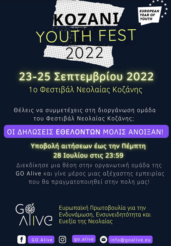 Ο οργανισμός νεολαίας “GO Alive” διοργανώνει το 1ο Φεστιβάλ Νεολαίας στην πόλη της Κοζάνης (23-25 Σεπτεμβρίου 2022), στο πλαίσιο του Ευρωπαϊκού Έτους Νεολαίας 2022 και αναζητά εθελοντές.