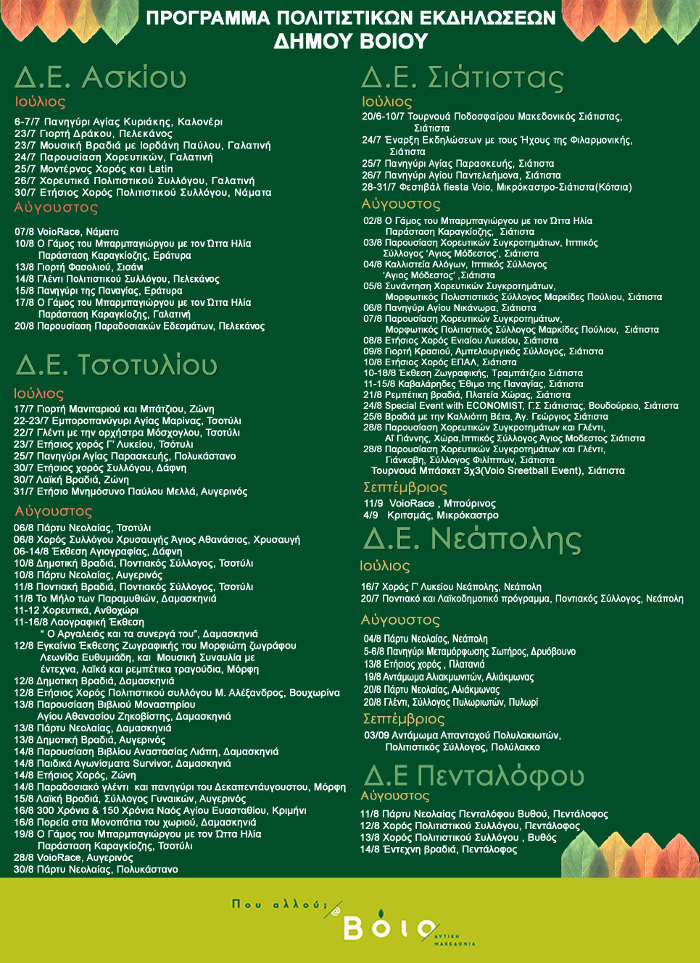 Το Καλοκαιρινό Πολιτιστικό Πρόγραμμα του Δήμου Βοΐου μαζί με το Φεστιβάλ Fiesta Voio, αποτελούν την πιο ολοκληρωμένη πρόταση πολιτισμού και διασκέδασης.