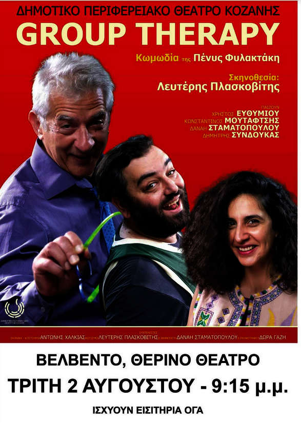 Το «Group Therapy» γράφτηκε το 2019 και παρουσιάζεται για πρώτη φορά στην Ελλάδα, από το ΔΗΠΕΘΕ ΚΟΖΑΝΗΣ, σε σκηνοθεσία Λευτέρη Πλασκοβίτη.
