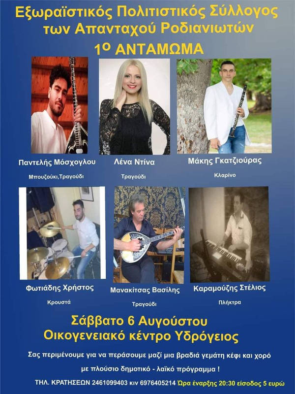Κοζάνη 04/08/2022 Έρχεται το 1ο Αντάμωμα Ροδιανιωτών το Σάββατο 6 Αυγούστου 0 Έρχεται το 1ο Αντάμωμα Ροδιανιωτών το Σάββατο 6 Αυγούστου. Περισσότερες πληροφορίες στην παραπάνω αφίσα.