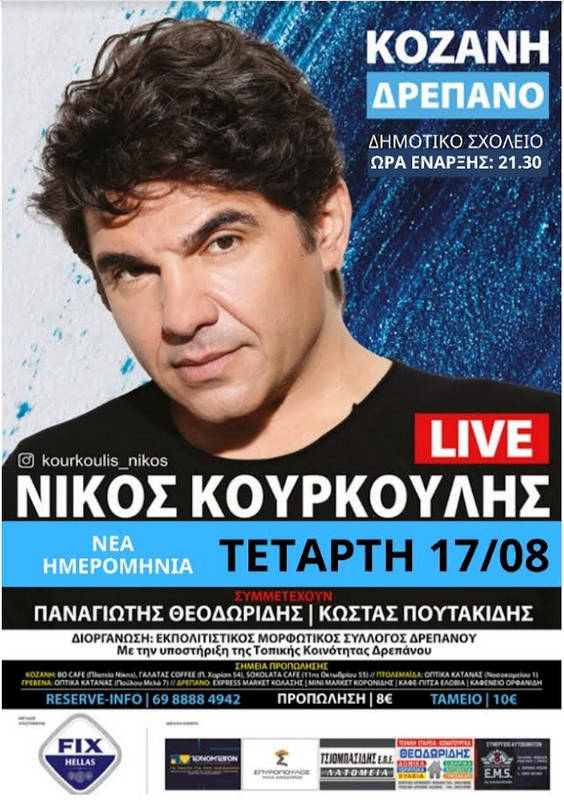Η άσχημη καιρική πρόγνωση με βροχοπτώσεις για την Παρασκευή, μας αναγκάζει να ορίσουμε ως ΝΕΑ ΗΜΕΡΟΜΗΝΙΑ για τη Μεγάλη Βραδιά με το Νίκο Κουρκούλη, την ΤΕΤΑΡΤΗ 17 ΑΥΓΟΥΣΤΟΥ 2022, με νέα ώρα έναρξης της εκδήλωσης, στις 9.30 το βράδυ.