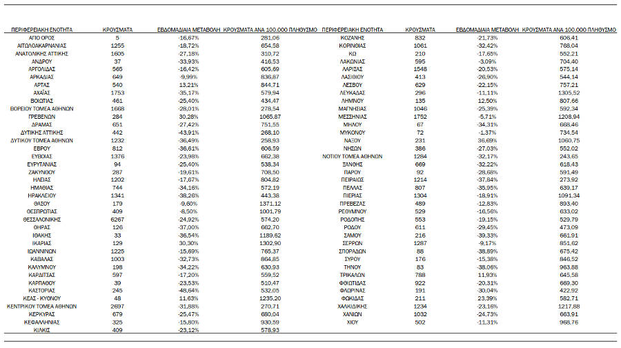 Τα στοιχεία που παρουσιάζονται αφορούν περιστατικά από την επιδημιολογική επιτήρηση της νόσου από το νέο κορωνοϊό (COVID-19). Τα δεδομένα αφορούν την εβδομάδα αναφοράς ISO 33/2022 (15 Αυγούστου 2022 – 21 Αυγούστου 2022). Την εβδομάδα αναφοράς καταγράφηκαν 55.769 κρούσματα COVID-19 (5.346 ανά εκατoμμύριο πληθυσμού: -25% εβδομαδιαία μεταβολή) εκ των οποίων οι επαναλοιμώξεις αφορούν το 22% των λοιμώξεων.