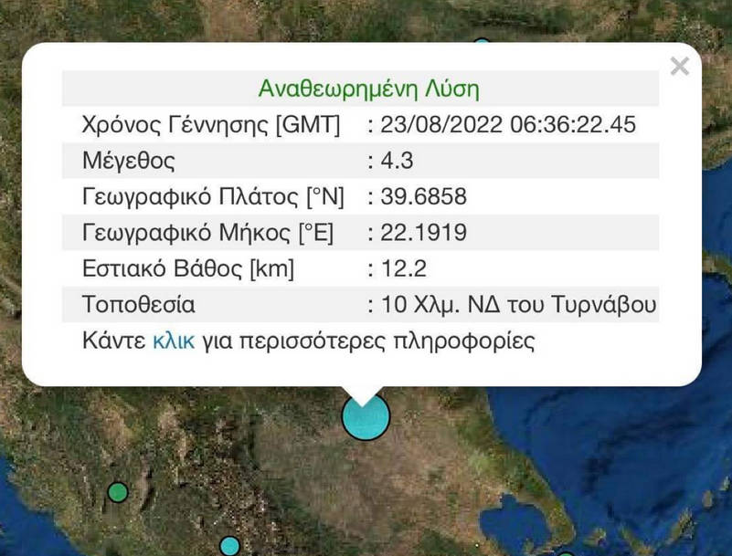 Η δόνηση έγινε στις 09.36 με επίκεντρο 10 χιλιόμετρα Νοτιοδυτικά του Τυρνάβου και εστιακό βάθος 12,2 μέτρα.