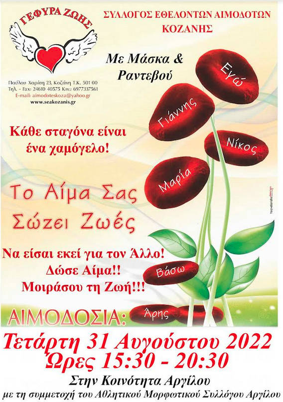 Την Τετάρτη 31 Αυγούστου 2022 συνεχίζουμε τις αιμοδοσίες με τη συμμετοχή του Αθλητικού Μορφωτικού Συλλόγου Αργίλου, από τις 15:30 – 20:30 (προσέλευση μέχρι 20:00), στα γραφεία της Κοινότητας Αργίλου με το τμήμα Αιμοδοσίας του «Μαμάτσειου» Γ.Ν. Κοζάνης. Επειδή υπάρχουν ελλείψεις αίματος στα νοσοκομεία πάρτε και ένα φίλο ή μια φίλη και ελάτε να ενισχύσουμε τα αποθέματα.!