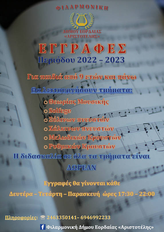 Οι εγγραφές γίνονται κάθε Δευτέρα – Τετάρτη – Παρασκευή από τις 17:30 ως τις 22:00, στον χώρο της Φιλαρμονικής (ημιυπόγειο του δημαρχείου Πτολεμαΐδας).