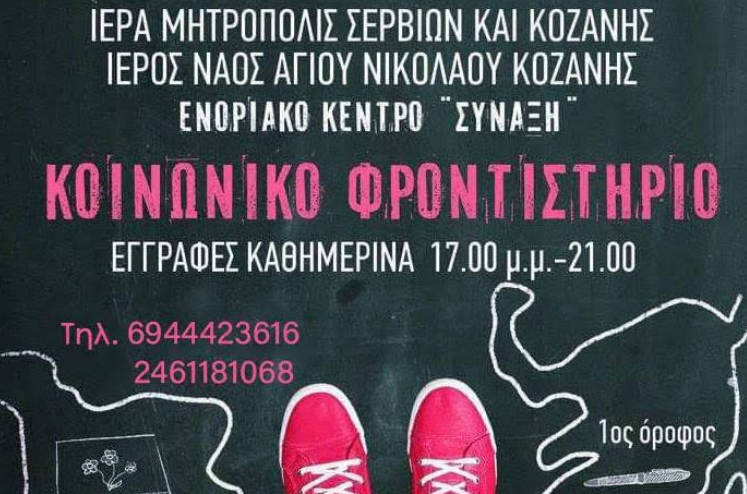 Το Κοινωνικό Φροντιστήριο της Ιεράς Μητροπόλεως Σερβίων και Κοζάνης θα λειτουργήσει και φέτος στο Μπλιούρειο Εκκλησιαστικό Ίδρυμα (στον 1ο όροφο, απέναντι από τον Άγιο Νικόλαο).