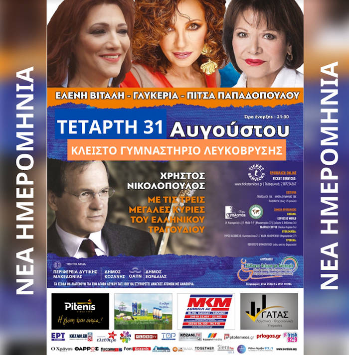 Νέα ημερομηνία για τη Μεγάλη Συναυλία με την Ελένη ΒΙΤΑΛΗ, τη ΓΛΥΚΕΡΙΑ, την Πίτσα ΠΑΠΑΔΟΠΟΥΛΟΥ και το Χρήστο ΝΙΚΟΛΟΠΟΥΛΟ, η ΤΕΤΑΡΤΗ 31 ΑΥΓΟΥΣΤΟΥ 2022 και ώρα 21.30, με νέο χώρο διεξαγωγής το ΚΛΕΙΣΤΟ ΓΥΜΝΑΣΤΗΡΙΟ ΛΕΥΚΟΒΡΥΣΗΣ.