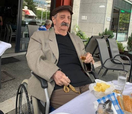 Περιστοιχισμένος από συγγενείς και φίλους μεσημεράκι στο καλομεζέδικο ουζερί ΜΠΙΖ-ΜΠΙΖΕ στη γειτονιά του στο «πέτρινο» σχολείο, σε μια τσιπουροπαρέα (όχι ο δάσκαλος πίνει το αγαπημένο του ουίσκι), αναπολεί και αφηγείται με περηφάνεια τα περπατήματά του, με έναν καθαρό και λιτό λόγο.