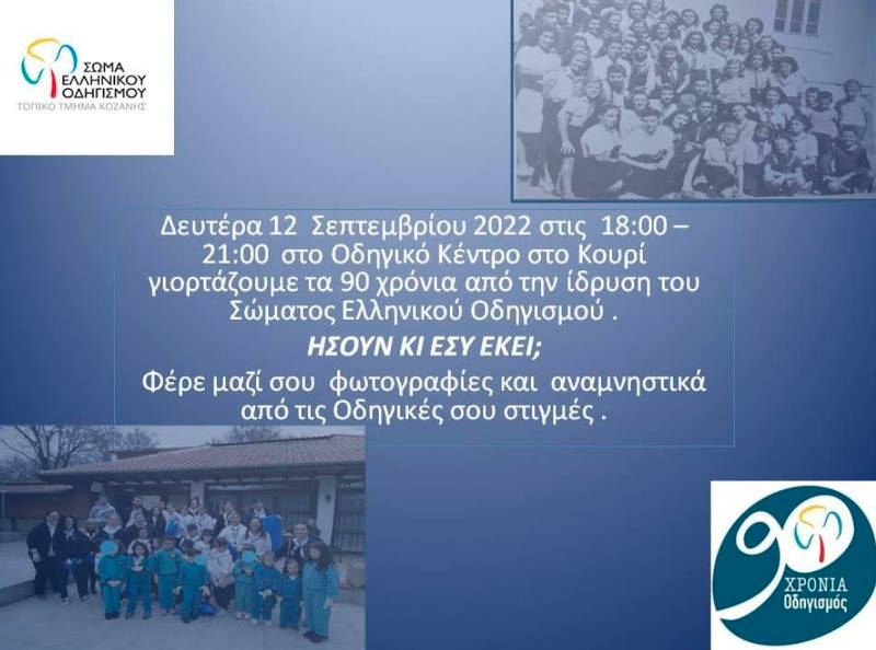 Το Τοπικό Συμβούλιο Κοζάνης του Σώματος Ελληνικού Οδηγισμού, σας προσκαλεί να γιορτάσουμε μαζί με παλαιά και νέα μέλη, τα 90 χρόνια από την ίδρυση του Οδηγισμού σε μια όμορφη ατμόσφαιρα στο Οδηγικό μας Κέντρο στο Κουρί τη Δευτέρα 12 Σεπτεμβρίου 2022 στις 18:00 – 21:00.