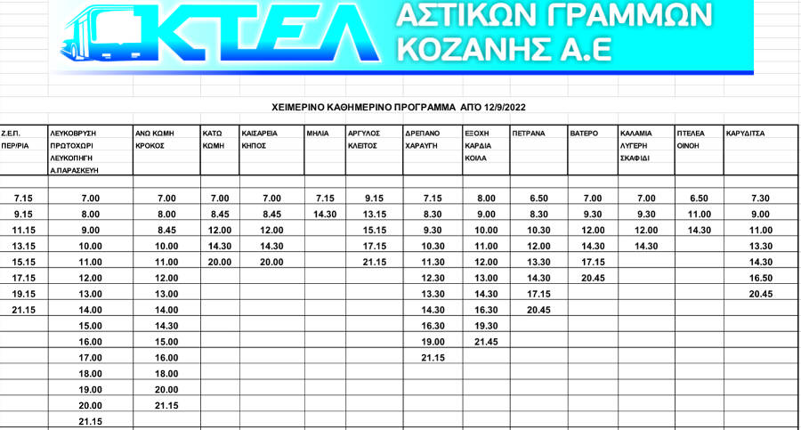 Κοζάνη 11/09/2022 Δείτε το χειμερινό καθημερινό πρόγραμμα των δρομολογίων των αστικών Κοζάνης 0 Δείτε το χειμερινό καθημερινό πρόγραμμα των δρομολογίων των αστικών Κοζάνης: