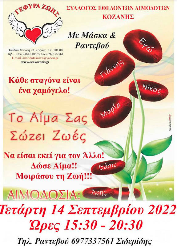 Αιμοδοσία την Τετάρτη 14 Σεπτεμβρίου 2022 από τις 15:30 – 20:20, (προσέλευση μέχρι 19:45), στα γραφεία του Συλλόγου, Π. Χαρίση 23 με το τμ. Αιμοδοσίας του «Μαμάτσειου» Γ.Ν. Κοζάνης