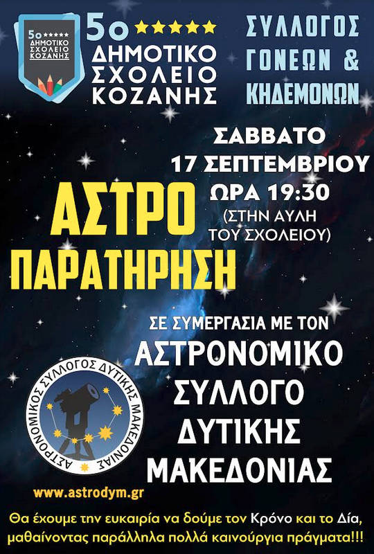 Ο Σύλλογος Γονέων & Κηδεμόνων του 5ου Δημοτικού Σχολείου σε συνεργασία με τον Αστρονομικό Σύλλογο Δυτικής Μακεδονίας σας καλούν σε μια βραδιά Αστροπαρατήρησης το Σάββατο 17 Σεπτεμβρίου 2022 και ώρα 19:30. Θα έχουμε την ευκαιρία να δούμε τον Κρόνο και το Δία, μαθαίνοντας παράλληλα πολλά καινούργια πράγματα!!!