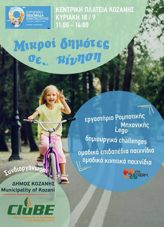 Ο Δήμος Κοζάνης και το Clube.gr στο πλαίσιο της Ευρωπαϊκής Εβδομάδας Κινητικότητας, καλούν τους μικρούς δημότες να συμμετάσχουν στην εκδήλωση «Μικροί δημότες σε κίνηση» και να αναλάβουν δράση.