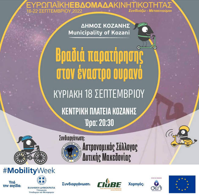 Ο Δήμος Κοζάνης στο πλαίσιο των δράσεων της Ευρωπαϊκής Εβδομάδας Κινητικότητας, διοργανώνει σε συνεργασία με τον Αστρονομικό Σύλλογο Δυτικής Μακεδονίας «Βραδιά παρατήρησης στον έναστρο ουρανό».