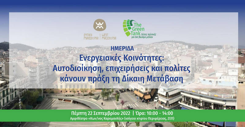 Η Περιφέρεια Δυτικής Μακεδονίας και η περιβαλλοντική δεξαμενή σκέψης The Green Tank συνδιοργανώνουν ημερίδα με θέμα «Ενεργειακές Κοινότητες: αυτοδιοίκηση, επιχειρήσεις και πολίτες κάνουν πράξη τη Δίκαιη Μετάβαση». Η ημερίδα θα πραγματοποιηθεί την Πέμπτη 22 Σεπτεμβρίου 2022, ώρα 10:00-14:00, στο Αμφιθέατρο «Κων/νος Καραμανλής», στο ισόγειο του κτιρίου της Περιφέρειας Δυτικής Μακεδονίας, στη ΖΕΠ.