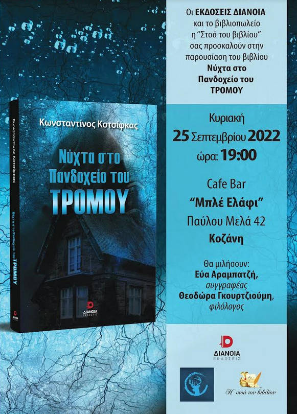Οι εκδόσεις Διάνοια και το βιβλιοπωλείο η “Στοά του βιβλίου” σας προσκαλούν στην παρουσίαση βιβλίου του συντοπίτη Κωνσταντίνου Κοτσίφκα “Νύχτα στο πανδοχείο του τρόμου” την Κυριακή 25 Σεπτεμβρίου στις 19:00 στο cafe-bar “Μπλέ Ελάφι” (Π.Μελά 42).