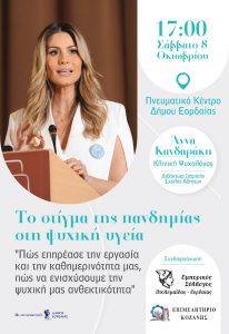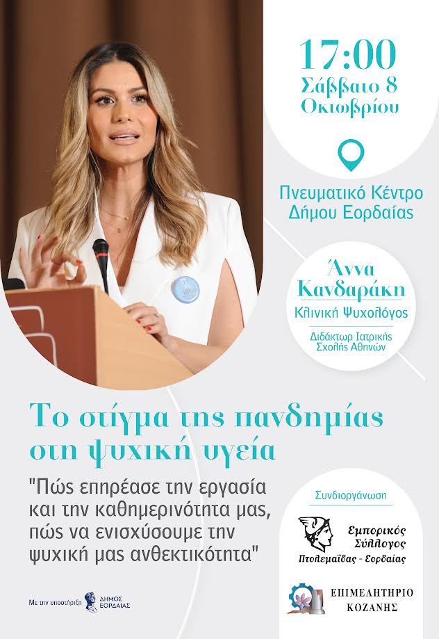 Το Σάββατο 8 Οκτωβρίου 2022 και ώρα 17:00, στο Πνευματικό Κέντρο του Δήμου Εορδαίας, θα πραγματοποιηθεί Εκδήλωση με κεντρική ομιλήτρια την Κλινική Ψυχολόγο και Διδάκτωρ Ιατρικής, Κυρία Άννα Κανδαράκη με θέμα «Το στίγμα της πανδημίας στη ψυχική υγεία. Πώς επηρέασε την εργασία και την καθημερινότητά μας, πώς να ενισχύσουμε την ψυχική μας ανθεκτικότητα», την οποία συνδιοργανώνει ο Εμπορικός Σύλλογος Πτολεμαΐδας – Εορδαίας και το Επιμελητήριο Κοζάνης.Με εκτίμηση,