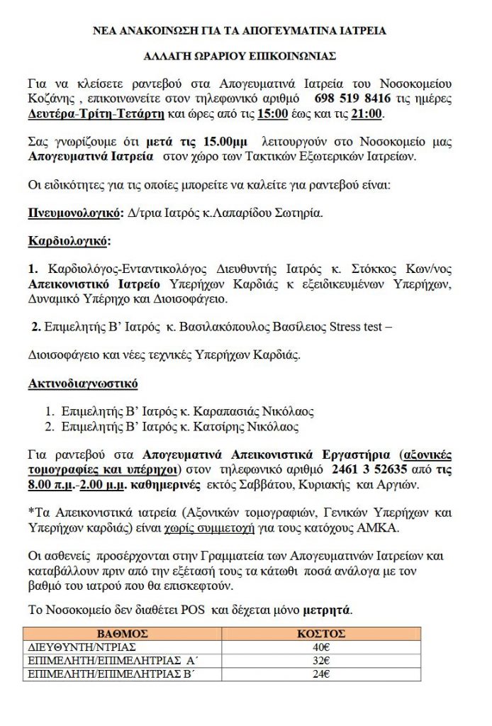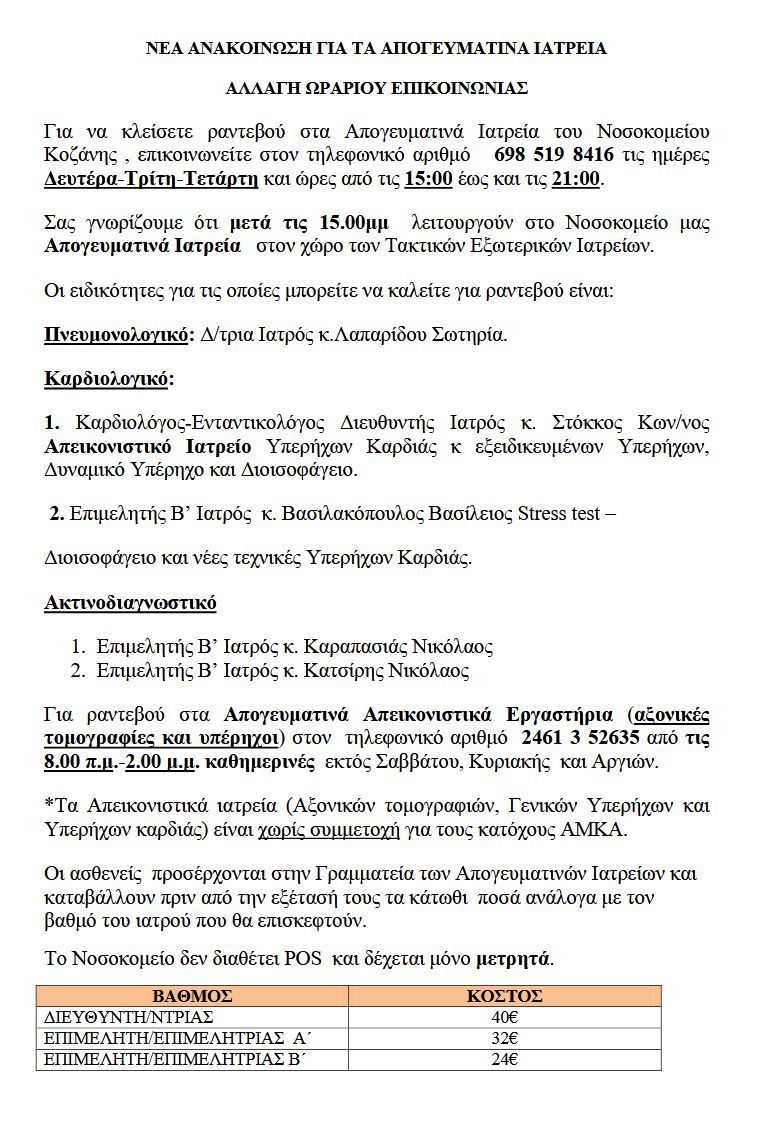 Νέα ανακοίνωση του Γ.Ν. Κοζάνης “Μαμάτσειο”, σχετικά με την αλλαγή ώρας στα απογευματινά ιατρεία  του νοσοκομείου.
