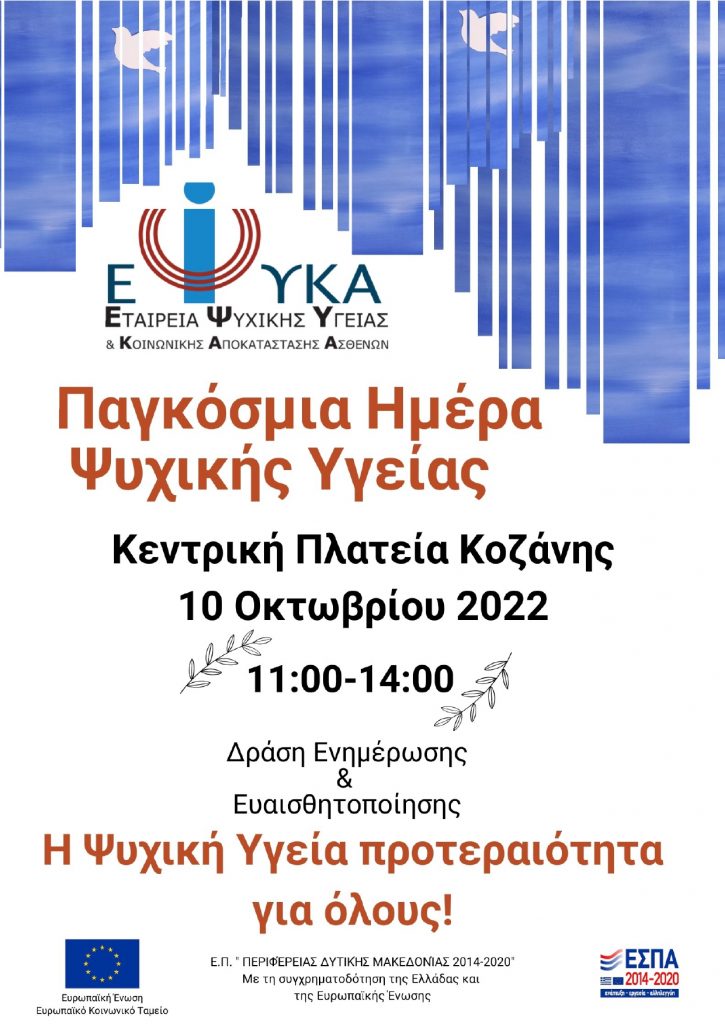 Στα πλαίσια της Παγκόσμιας Ημέρας Ψυχικής Υγείας , που τιμάται στις 10 Οκτωβρίου κάθε χρόνο, οι δομές της Ε.Ψ.Υ.Κ.Α. στους Νομούς Κοζάνης και Γρεβενών, η Κινητή Μονάδα Ψυχικής Υγείας, τα προγράμματα Υπηρεσιών Κατ΄οίκον Νοσηλείας και Παιδοψυχιατρικών Υπηρεσιών, το Δ’ Ψυχογηριατρικό Οικοτροφείο Σερβίων και το Προστατευόμενο Διαμέρισμά του, διοργανώνουν δράση ενημέρωσης και ευαισθητοποίησης των πολιτών, τη Δευτέρα 10 Οκτωβρίου 2022 στην κεντρική Πλατεία της Κοζάνης και ώρες 11:00 με 14:00.