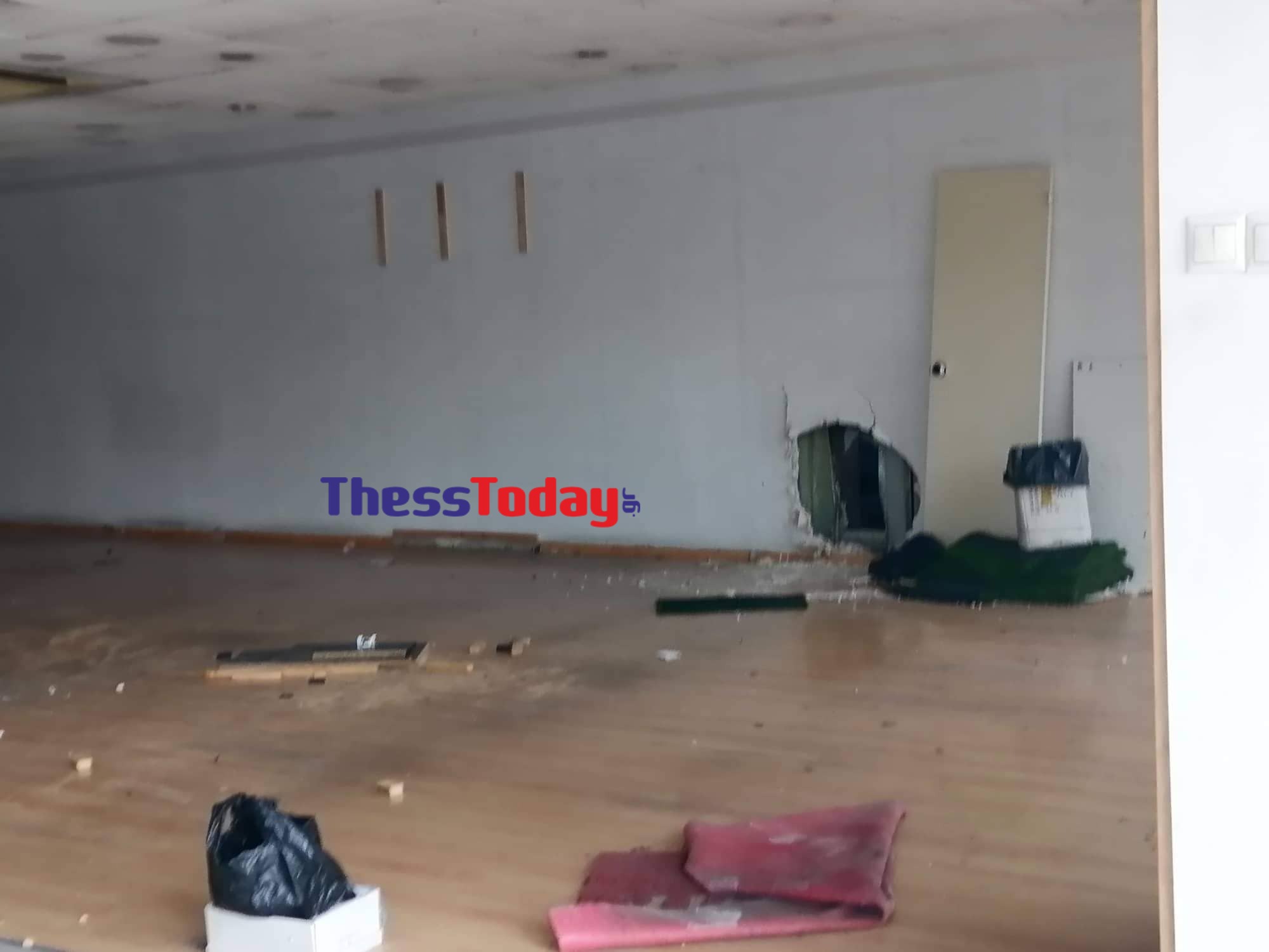 Νωρίτερα το ίδιο άτομο μπήκε σε εγκαταλελειμμένη επιχείρηση ρούχων, η οποία όμως διαχωρίζεται με γυψοσανίδα με το κατάστημα. Τότε, με τη βοήθεια αντικειμένου (εκτιμάται σφυριού λόγω χτυπημάτων) τρύπωσε κυριολεκτικά στο κατάστημα.
