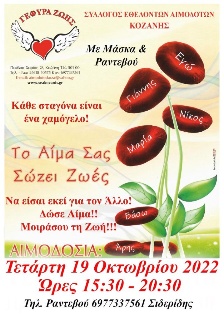 Η 30η Αιμοδοσία του 2022 γίνεται την Τετάρτη 19 Οκτωβρίου 2022 από τις 15:30 – 20:30, (προσέλευση μέχρι 19:50), στα γραφεία του Συλλόγου, Π. Χαρίση 23 με το τμήμα Αιμοδοσίας του Γ.Ν. Κοζάνης. Για ραντεβού 6977337561 Δημ. Σιδερίδης
