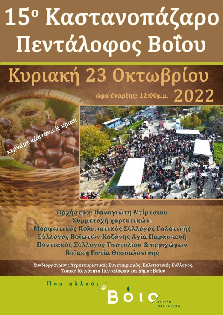 Ο Δήμος Βοΐου, η Τοπική Κοινότητα Πενταλόφου, ο Αγροτουριστικός Συνεταιρισμός και ο Πολιτιστικός Σύλλογος Πενταλόφου διοργανώνουν την Κυριακή 23 Οκτωβρίου 2022 το 15ο Καστανοπάζαρο στην πλατεία Πενταλόφου.