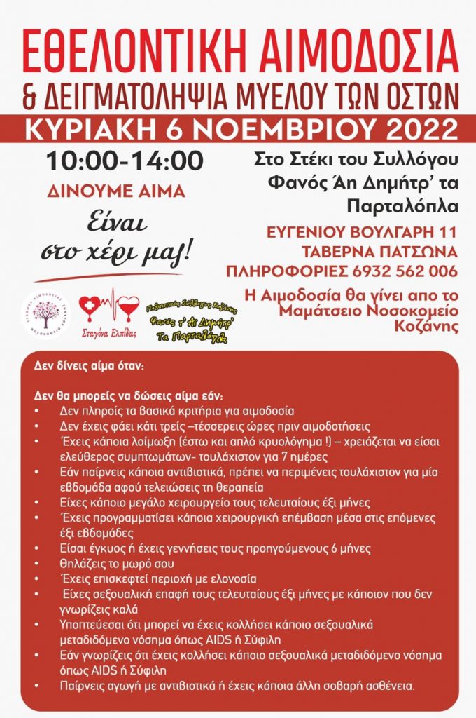 Κοζάνη 01/11/2022 Εθελοντική αιμοδοσία & δειγματοληψία μυελού των οστών στο στέκι του συλλόγου Φανός ‘Αη Δημήτρ’’ 0 Εθελοντική αιμοδοσία & δειγματοληψία μυελού των οστών την Κυριακή 6 Νοεμβρίου, στο στέκι του συλλόγου Φανός ‘Αη Δημήτρ’ τα Παρταλόπλα.’