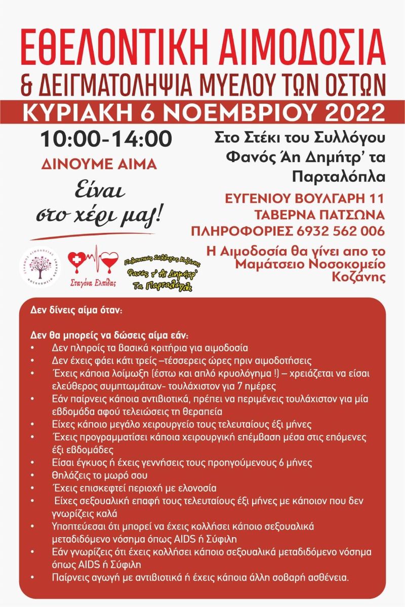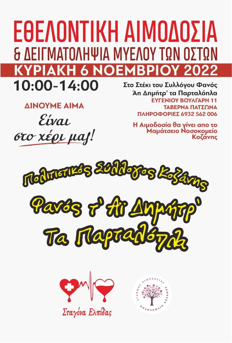 Την Κυριακή 6 Νοεμβρίου η κινητή μονάδα αιμοδοσίας του Μαμάτσιου Νοσοκομείου θα βρίσκεται στον χώρο του πολιτιστικού συλλόγου “Παρταλόπλα [δίπλα από την ταβέρνα Πλάτανος], τον Σύλλογο Σαμαριναίων Κοζάνης και τον Σύλλογο Εθελοντών Αιμοδοτων Σταγόνα Ελπίδας, για την εθελοντική αιμοδοσία .
