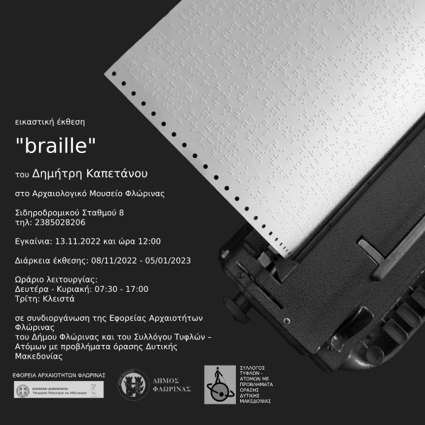Θα θέλαμε να σας καλέσουμε στα εγκαίνια της εικαστικής έκθεσης του Δημήτρη Καπετάνου με τίτλο braille, σε συνδιοργάνωση της Εφορείας Αρχαιοτήτων Φλώρινας, του Δήμου Φλώρινας και