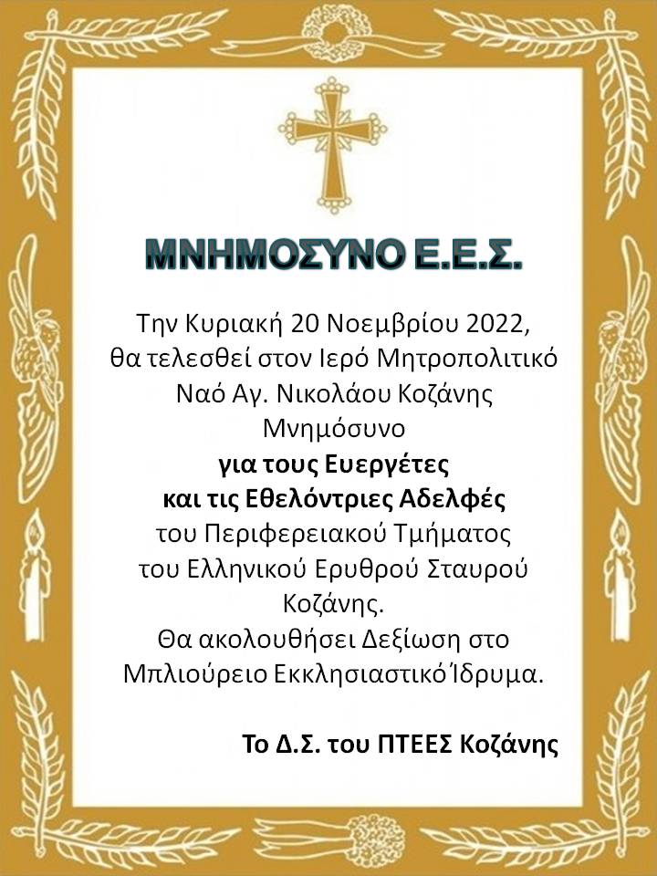 Την Κυριακή 20 Νοεμβρίου 2022, θα τελεσθεί στον ιερό Μητροπολιτικό Ναό Αγ. Νικολάου Κοζάνης Μνημόσυνο για τους Ευεργέτες και τις Εθελόντριες Αδελφές του Περιφερειακού Τμήματος του Ελληνικού Ερυθρού Σταυρού Κοζάνης. Θα ακολουθήσει Δεξίωση στο Μπλιούρειο Εκκλησιαστικό Ίδρυμα.