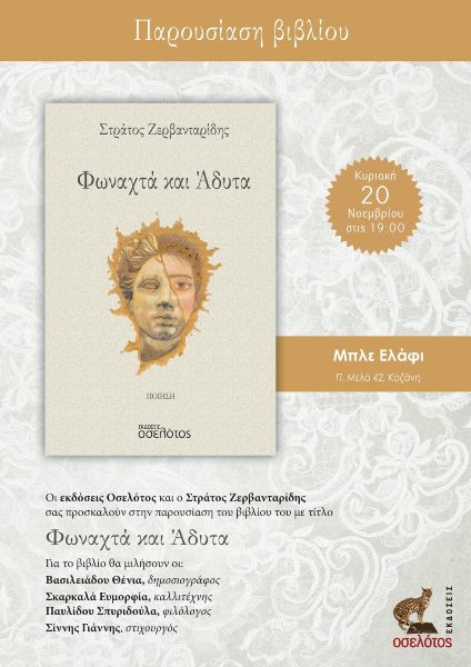 Οι εκδόσεις Οσελότος και ο Στράτος Ζερβανταρίδης, σας προσκαλούν στην παρουσίαση του βιβλίου του με τίτλο Φωναχτά και Άδυτα, την Κυριακή 20 Νοεμβρίου στις 19:00, στο καφέ Μπλέ Ελάφι (Π.