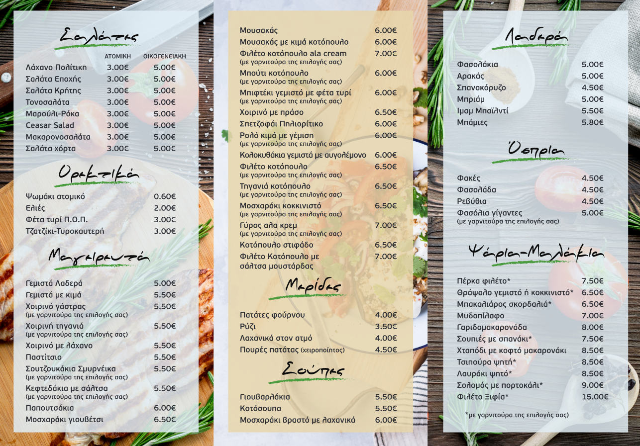 Μαγειρευτά φαγητά, γαρνιτούρες, λαδερά, σούπες, ψάρια-μαλάκια, ζυμαρικά, όσπρια, σαλάτες, ορεκτικά… με ένα τηλεφώνημα στο 2461038030 έρχονται στην πόρτα σας!