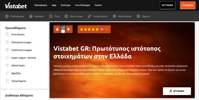 Αυτό δεν σημαίνει ότι οι πιθανότητες όλων των σπιτιών είναι καλές. Ή ότι όλοι έχουν καλά μπόνους ή καλές πολιτικές κατάθεσης και ανάληψης. Για αυτό το λόγο επιλέξαμε τον καλύτερο bookmaker με διάφορες μεθόδους αθλητικών στοιχημάτων, τη Vistabet.