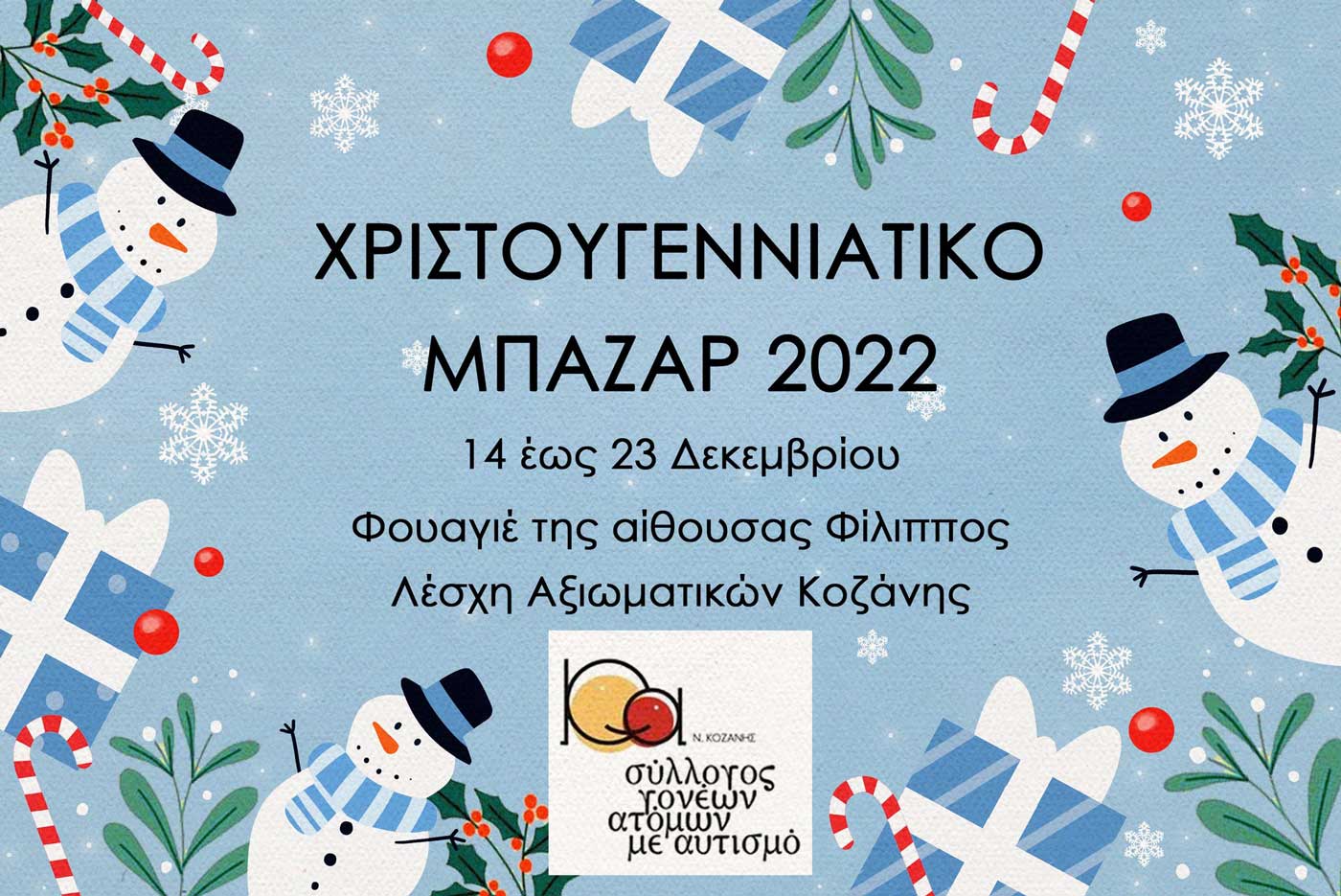 Κοζάνη 28/11/2022 Χριστουγεννιάτικο μπαζάρ του Συλλόγου Γονέων Ατόμων με Αυτισμό στην αίθουσα ‘Φίλιππος’ στην Κοζάνη 0 Από τις 14 έως και 23 Δεκεμβρίου θα πραγματοποιηθεί εφέτος το Χριστουγεννιάτικο Μπαζάρ του Συλλόγου Γονέων Ατόμων με Αυτισμό. Το μπαζάρ θα γίνει στο Φουαγιέ της Λέσχης Αξιωματικών Κοζάνης.