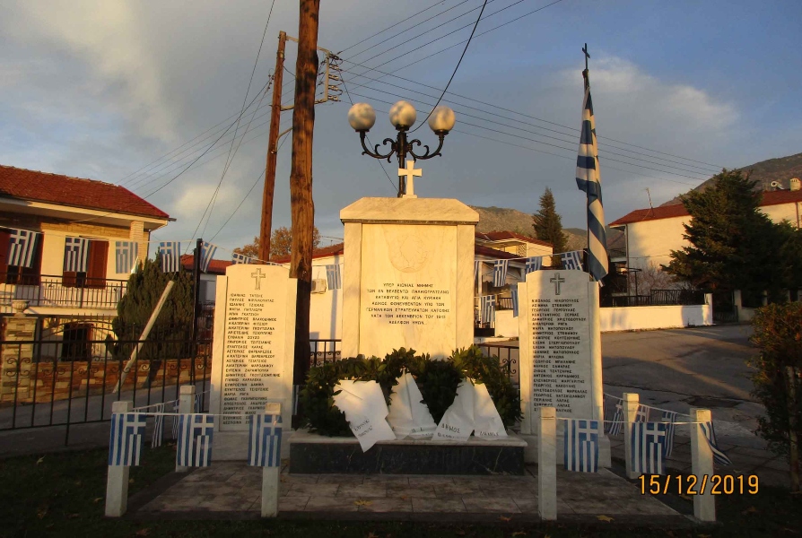 β. Στο Μνημείο (στην πλατεία): Επιμνημόσυνη δέηση, κατάθεση στεφάνων, σιγή ενός λεπτού. Εθνικός Ύμνος.