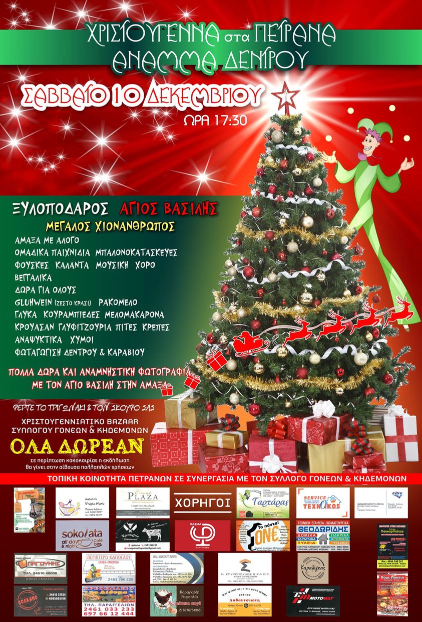 Αυτό το ΣΑΒΒΑΤΟ 10 Δεκεμβρίου και ώρα 17:30 όλοι οι δρόμοι οδηγούν στην κεντρική πλατεία Πετρανών για την φωταγώγηση δέντρου και καραβιού.