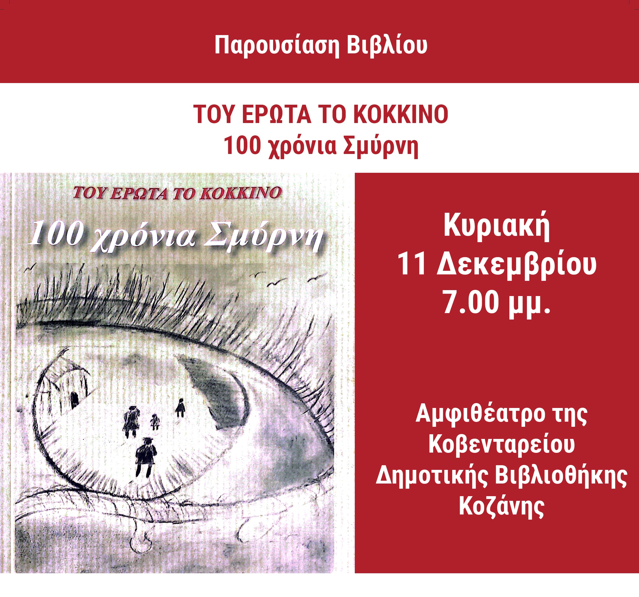 Παρουσίαση του βιβλίου «ΤΟΥ ΕΡΩΤΑ ΤΟ ΚΟΚΚΙΝΟ – 100 ΧΡΟΝΙΑ ΣΜΥΡΝΗ», θα πραγματοποιηθεί την Κυριακή 11 Δεκεμβρίου 2022, ώρα 17.00, στο Αμφιθέατρο της Κοβενταρείου Δημοτικής Βιβλιοθήκης Κοζάνης.