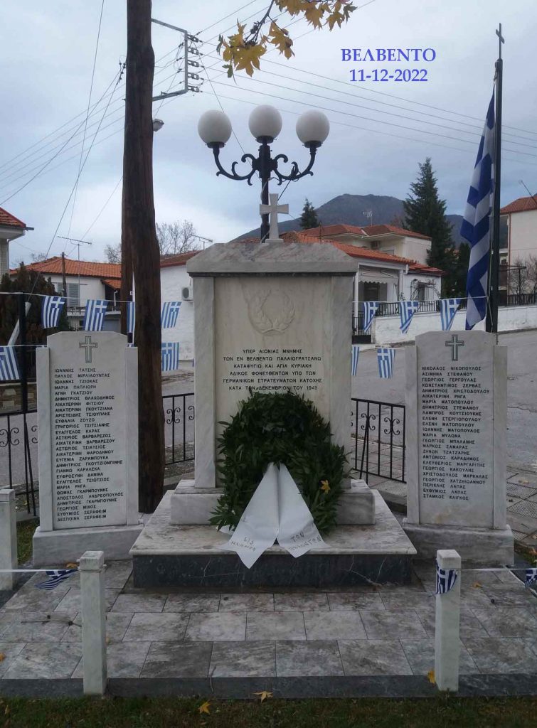 Πραγματοποιήθηκε (11-12-2022) στο Βελβεντό (με επίκεντρο τον Ι. Ενοριακό Ναό του Αγίου Διονυσίου εν Ολύμπω) η ‘’Ημέρα Μνήμης – Δεκέμβριος 2022’’ για το ‘’Ολοκαύτωμα των Πιερίων – Δεκέμβριος 1943’’ από τα γερμανικά – ναζιστικά στρατεύματα Κατοχής.