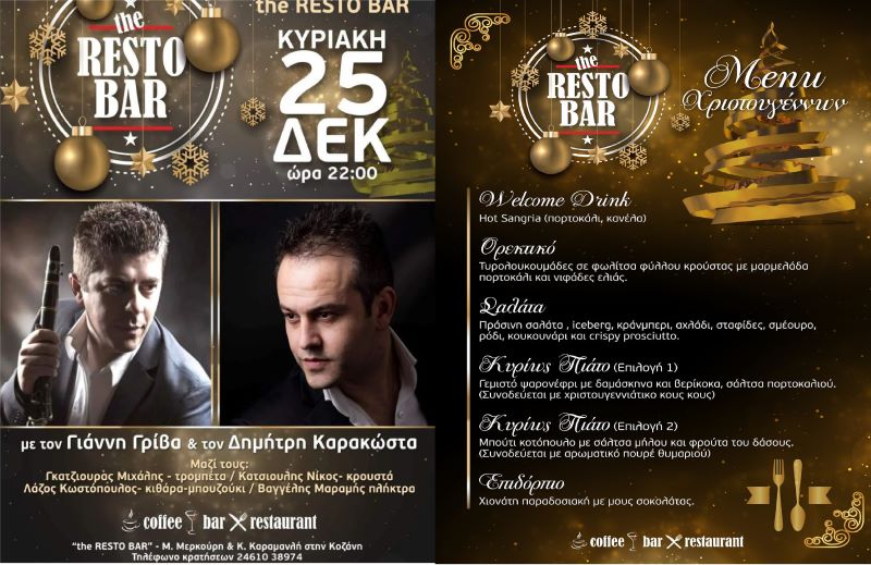 Με τον Γιάννη Γρίβα στο κλαρίνο και τον Δημήτρη Καρακώστα στο τραγούδι θα γιορτάσουν την ημέρα των Χριστουγέννων, όσοι επιλέξουν να απολαύσουν μία ξεχωριστή μουσική βραδιά.
