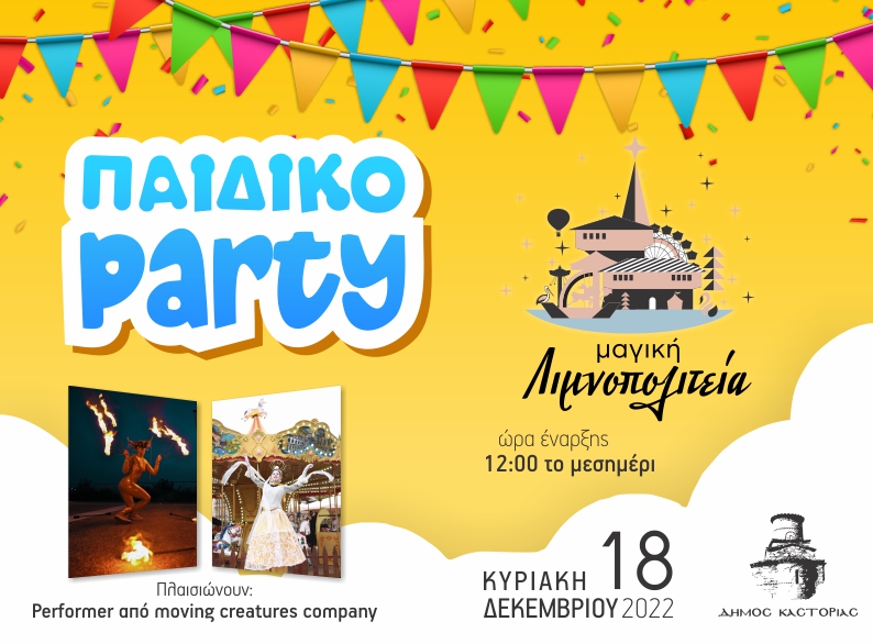 Την Κυριακή 18 Δεκεμβρίου στις 12.00 το μεσημέρι, εντυπωσιακοί ζογκλέρ, ξυλοπόδαροι και ξεκαρδιστικοί διασκεδαστές περιμένουν τους μικρούς μας φίλους και όλους όσοι αισθάνονται παιδιά να συμμετάσχουν στο πολύχρωμο πάρτι που θα πραγματοποιηθεί στη Μαγική Λιμνοπολιτεία!