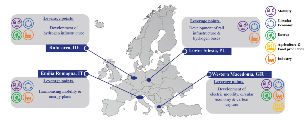Τέσσερα Transition Super-Labs (TLS) θα αναπτυχθούν σε τέσσερις ευρωπαϊκές περιφέρειες, με στόχο την αντιμετώπιση μίας ιδιαίτερα δύσκολης μεταβατικής πρόκλησης: Περιφέρεια Δυτικής Μακεδονίας (Ελλάδα), Περιφέρεια Ρουρ (Γερμανία), Περιφέρεια Εμίλια Ρομάνια (Ιταλία) και Περιφέρεια Κάτω Σιλεσία (Πολωνία). Τα Transition Super-Labs θα ασχοληθούν με πέντε βασικούς τομείς: Κινητικότητα, Κυκλική Οικονομία, Ενέργεια, Αγροτική παραγωγή & Παραγωγή τροφίμων και Βιομηχανία εφαρμόζοντας δια τομεακούς μηχανισμούς.