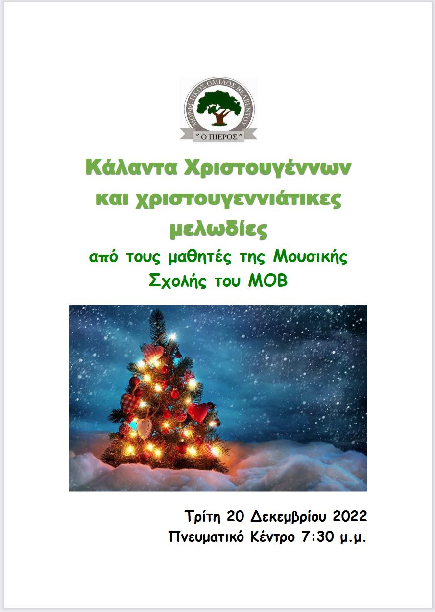 Σέρβια - Βελβεντό 20/12/2022 Χριστουγεννιάτικη εκδήλωση της Μουσικής Σχολής του Μορφωτικού Ομίλου Βελβεντού 0 Σας προσκαλούμε στην Χριστουγεννιάτικη εκδήλωση της Μουσικής Σχολής του ΜΟΒ που θα πραγματοποιηθεί την Τρίτη 20 Δεκεμβρίου στις 19:30 στο Πνευματικό Κέντρο Βελβεντού. Σας περιμένουμε με χαρά.