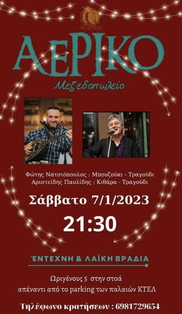 Το ‘ΑΕΡΙΚΟ’ στην όμορφη στοά του σας καλεί στην έντεχνη λαϊκή βραδιά, με δύο εξαιρετικούς μουσικούς τραγουδιστές.