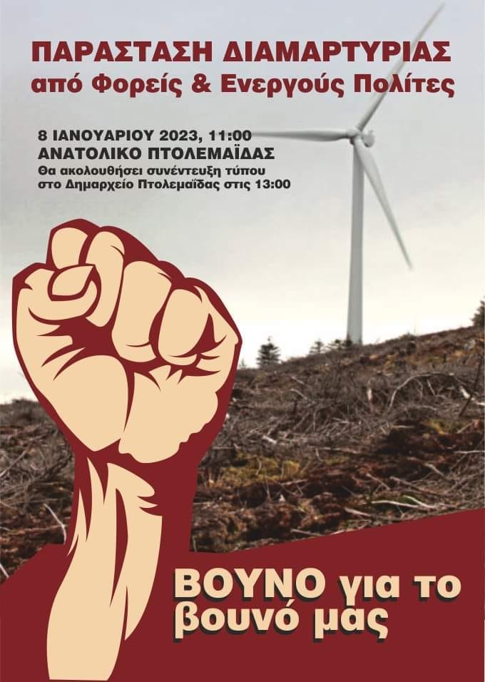 Στις 8 του Γενάρη, στις 11 η ώρα το πρωί, ομάδες από όλη την περιοχή, όπως και από την ομάδα SOS Βέρμιο, σύλλογοι, σωματεία , και ο Δήμος Εορδαίας θα ανταμώσουμε στο εργοτάξιο αιολικών στο Βέρμιο.Μπροστά στο Γυμνάσιο Ανατολικού, θα γίνει μία συμβολική κατάληψη του δρόμου, μία παράσταση διαμαρτυρίας.