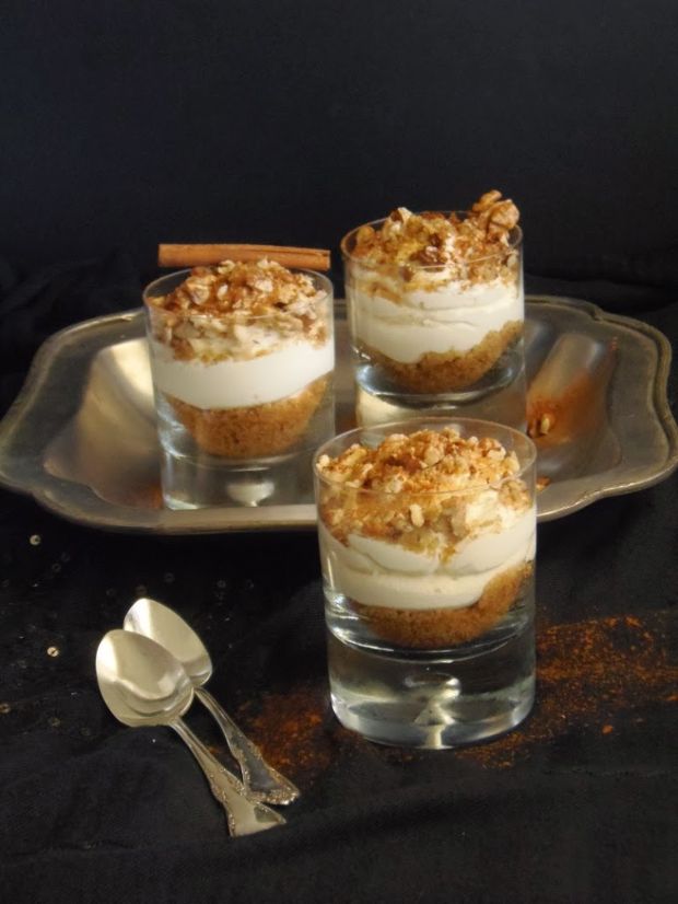 Μοιράζουμε την κρέμα στα ποτηράκια. Αν θέλουμε πιο όμορφο οπτικό αποτέλεσμα χωρίς να τα πασαλείψουμε, κάνουμε αυτή τη διαδικασία με κορνέ ζαχαροπλαστικής. Διαφορετικά μοιράζουμε την κρέμα με ένα κουτάλι. Τοποθετούμε τα ποτήρια στο ψυγείο για τουλάχιστον δύο ώρες μέχρι να παγώσει η κρέμα.
